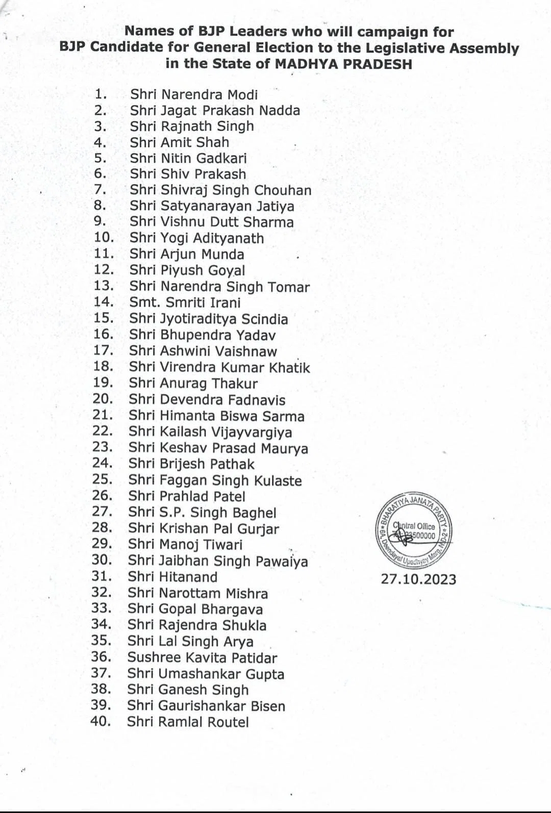मध्यप्रदेश : (मानवीय सोच) विधानसभा चुनाव में मुख्यमंत्री योगी आदित्यनाथ, उप मुख्यमंत्री केशव प्रसाद मौर्य और ब्रजेश पाठक भी स्टार प्रचारक बनाए गए हैं। भाजपा की ओर से घोषित स्टार प्रचारकों की सूची में यूपी के कई दिग्गज नेता शामिल हैं। 40 सदस्यीय स्टार प्रचारकों की सूची में यूपी से रक्षा मंत्री राजनाथ सिंह, केंद्रीय मंत्री स्मृति ईरानी और एसपी सिंह बघेल का भी नाम है।