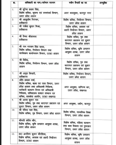 अमृत त्रिपाठी को नियोजन विभाग में विशेष सचिव के पद पर तैनात किया गया है। ओम प्रकाश वर्मा को अपर आयुक्त, वाणिज्य कर, अटल कुमार राय को अपर आयुक्त, उद्योग कानपुर, रविंद्र पाल सिंह को विशेष सचिव, माध्यमिक शिक्षा विभाग, संदीप कौर को विशेष सचिव महिला कल्याण तथा बाल विकास एवं पुष्टाहार विभाग व डॉ. अरविंद कुमार चौरसिया को विशेष सचिव, कृषि उत्पादन आयुक्त शाखा के पद पर तैनाती दी गई है। यहां देखें पूरी सूची: