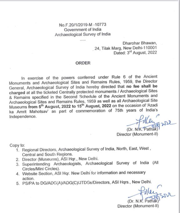 सोशल मीडिया पर घोषणा करते हुए रेड्डी ने एएसआई के एक बयान को साझा किया। इसमें कहा गया है कि उत्सव के हिस्से के रूप में 5 से 15 अगस्त तक किसी भी टिकट वाले केंद्रीय संरक्षित स्मारकों के साथ-साथ पुरातत्व स्थल संग्रहालयों पर कोई शुल्क नहीं लिया जाएगा। रेड्डी ने लिखा कि एएसआई ने 5 और 15 अगस्त से देश भर में अपने सभी संरक्षित स्मारकों/स्थलों पर आगंतुकों/पर्यटकों के लिए प्रवेश निःशुल्क कर दिया है।