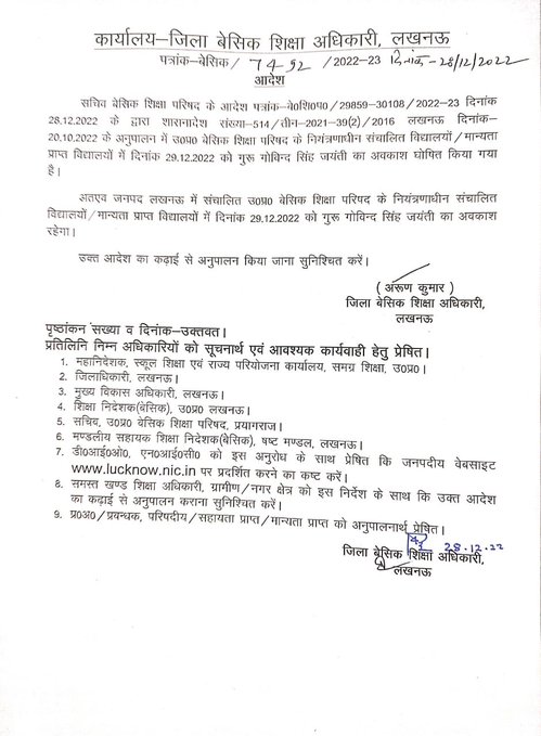 डीआईओएस डॉ धर्मवीर सिंह की ओर से जारी आदेश में कहा गया है, ‘जिलाधिकारी महोदय द्वारा जारी अवकाश तालिका में कार्यकारी आदेशों के अंतर्गत दिनांक 20 दिसंबर 2022 को श्री गुरुगोविंद सिंह जयंती के उपलक्ष्य में अवकाश घोषित किया गया है। जिसके तहत 29 दिसंबर को जनपद के सभी माध्यमिक, राजकीय, अशासकीय, वित्तविहीन मान्यता प्राप्त, आईसीएसई और सीबीएसई के स्कूल बंद रहेंगे।