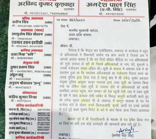 सेंट्रल बार एसोसिएशन लखनऊ ने लिखा- सीएम योगी को पत्र