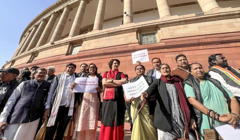 अदाणी मामले पर विपक्षी सांसदों ने संसद परिसर में किया प्रदर्शन
