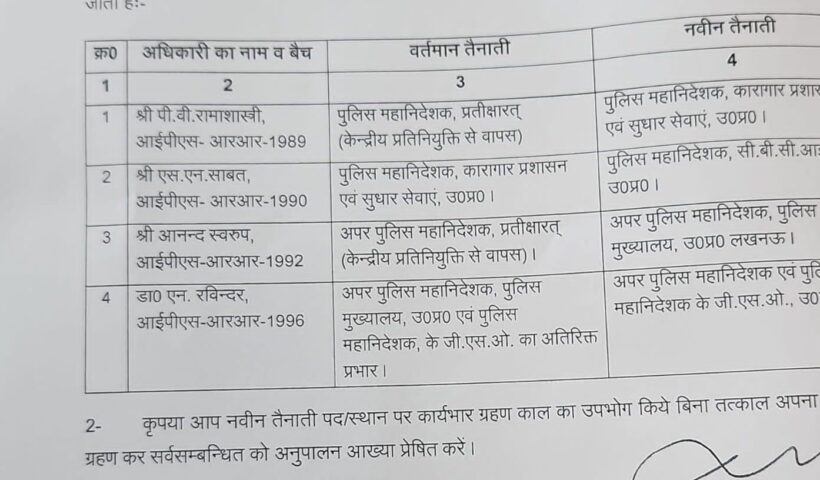 उत्तर प्रदेश में चार आईपीएस अधिकारियों का तबादला। डीजी जेल एसएन साबत हटाए गए। पीवी रामशास्त्री नए डीजी जेल होंगे