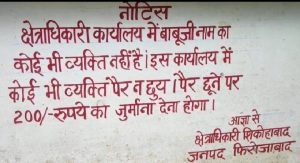 सीओ शिकोहाबाद कमलेश सिंह ने अपने कार्यालय के बाहर लिखवाया है कि इस कार्यालय में बाबूजी नाम का कोई व्यक्ति नहीं है। किसी व्यक्ति के कोई पैर न छुए। पैर छूने पर दो सौ रुपया जुर्माना लगेगा। सीओ के इस कदम की खासतौर से शिकोहाबाद सर्किल के ग्रामीण क्षेत्र में लोग खूब तारीफ कर रहे हैं। युवाओं का कहना है कि पुलिस अधिकारी के इस रवैये से आमजन में पुलिस की जो खराब छवि बनी हुई है उसके प्रति लोगों की धारणा में काफी बदलाव आएगा। यही नहीं लोग अपनी बात को बड़े ही आत्म विश्वास के साथ पुलिस अधिकारी के समक्ष रख सकेंगे। सीओ के इस कदम उठाने के बाद यह सोशल मीडिया में चर्चा का विषय बना हुआ है वहीं हर कोई इसकी तारीफ करते नहीं थक रहे हैं।