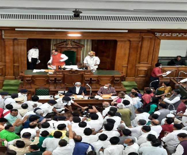 पटना : (मानवीय सोच) बिहार विधानसभा में प्रश्नकाल के दौरान बड़ी घटना होने से बच गई. कहा जा रहा है कि सत्ता पक्ष की तरफ से गाली दी गई, तो प्रश्न कर रहे भाजपा विधायक लखिन्द्र पासवान ने माइक तोड़ दिया. इसके बाद सत्तापक्ष और विपक्ष आमने-सामने आ गए. इस दौरान मामला काफी बढ़ गया. स्थिति इतनी खराब हो गई कि सदन की कार्यवाही दोपहर 2 बजे तक स्थगित करनी पड़ी.